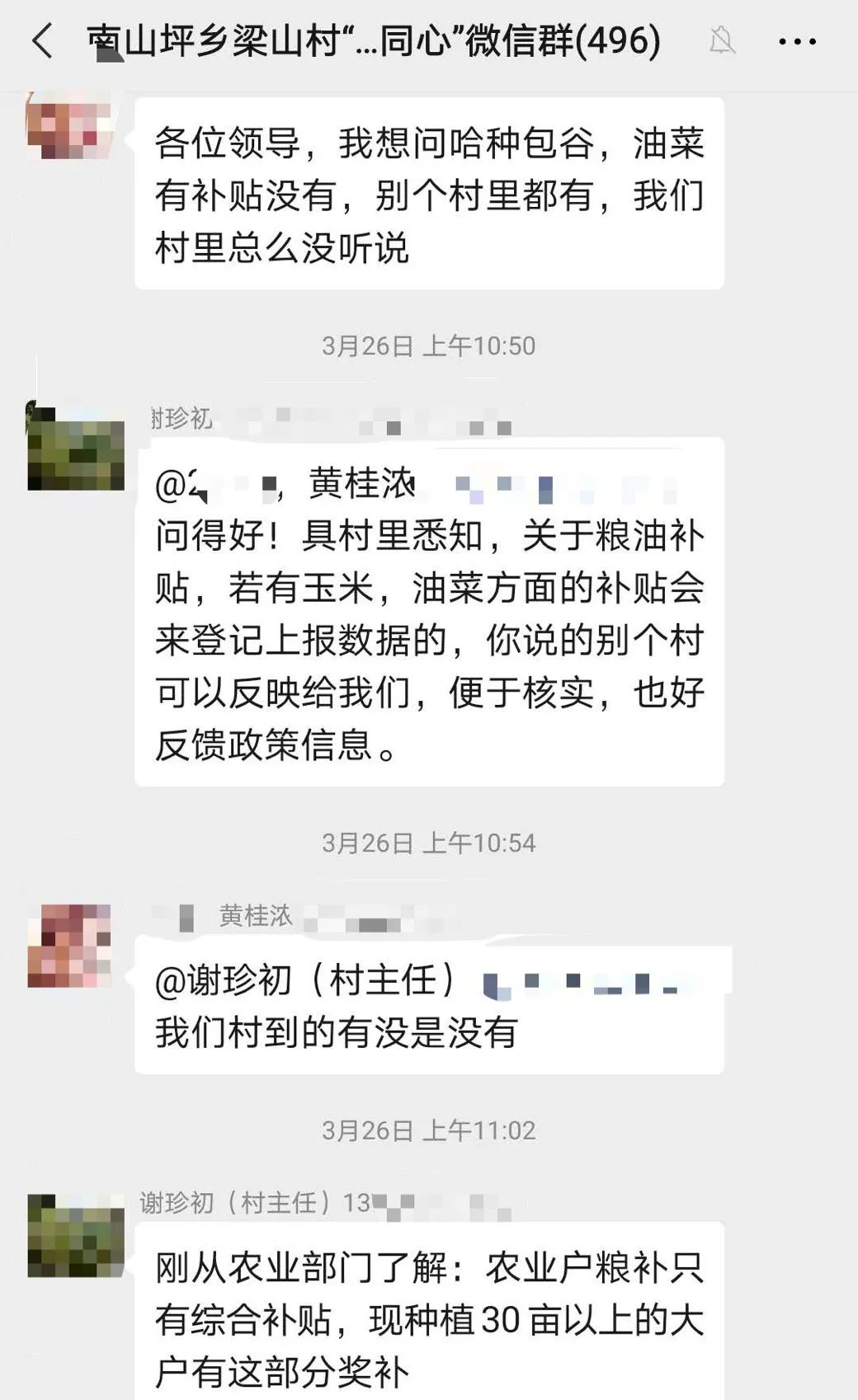 “谢主任,我想问哈种包谷、油菜有补贴没有,邻村都有,我们村怎么没听说?”