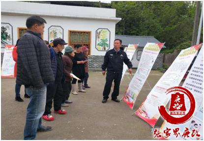 图为犀牛村辅警正在为党员群众进行扫黑除恶的宣传