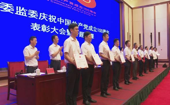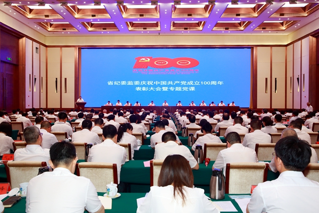 6月28日,省纪委监委举行表彰大会暨专题党课,热烈庆祝中国共产党成立100周年。会议为委机关“光荣在党50年”的老党员颁发纪念章,表彰一批年度优秀共产党员、优秀党务工作者、优秀群团工作者和先进党支部。省委常委、省纪委书记、省监委代理主任王双全围绕“切实强化政治监督 当好党的忠诚卫士”讲专题党课。省委党史学习教育第四巡回指导组组长张云英一行到会指导。省纪委常务副书记、省监委副主任许忠建主持会议。